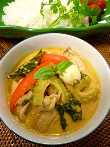 タイ風ゴーヤと豚肉のレッドカレー!! 2009年06月22日 昨日はタイ料理!! 夏野菜のゴーヤと豚肉を使って ココナッツが香るタイレッドカレー。 プルプル豚肉に、ゴーヤの苦味、 レッドカレーの辛味とココナツミルクの甘味の バランスが最高~!! グリーンカレー、レッドカレー、イエローカレーの 順に辛くなります。 お ...