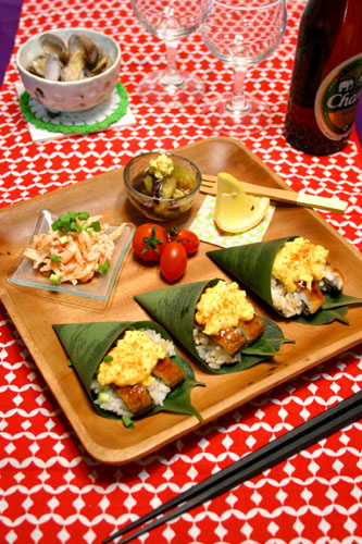 鰻玉笹寿司☆即席夏仕立てプレート! 2010年07月28日 今日は土用丑の日の鰻料理!! 少量の鰻で夏らしく・・・ 笹の葉にごはんと一緒に包んで、 チーズ入りふわっふわスクランブルエッグを乗せました~!! ガラスの小皿に盛り付けたおかずと共に 夏仕立てのワンプレートに!! 笹の香りがとっても清涼感たっぷり(^^♪ 円錐 ...