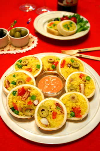 スペインパエリア風イカ飯☆ 2011年02月09日 今日はスペイン風イカ飯!! イカをまるごと使って・・ ゲソとサフランで炊いたごはんをイカに詰めて・・ フライパンで蒸し焼きにしました~!! お好みでオーロラソースをつけて・・・ パエリアに中に入れるイカを器にしたパーティー仕立て(^^♪ ワインのおつまみにも ...