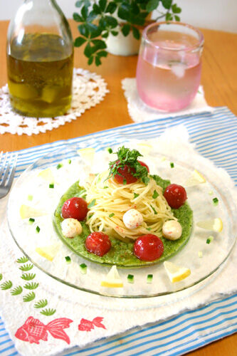 胡瓜と大葉ソースの冷製パスタ☆ 2011年06月23日 今日は冷製パスタ!! 夏らしく胡瓜と大葉をたっぷりペーストにした冷製パスタ!! ミニトマトとクリームチーズのマリネを加えて鮮やかに・・(^^♪ パルメザンチーズでコクをだしたジェノベーゼパスタの胡瓜バージョン?? のようなパスタです(^^♪ 先日レストランで大葉 ...