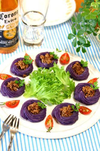 紫じゃがいもの一口コテージパイ風☆とろとろ~!! 2011年06月30日 今日はじゃがいも料理!! 日曜日にに主人の実家でお婆ちゃんの趣味の家庭菜園で 出来た紫色のじゃがいもをいただいたので一口コテージパイ風を・・・。 マッシュポテトとひき肉ソースを重ねてオーブンで焼いた イギリスの家庭料理コテージパイ!! 今回はせっかくの紫 ...