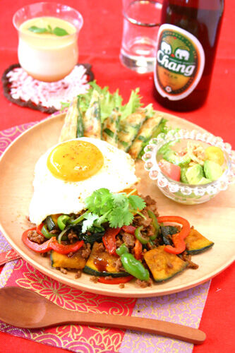 かぼちゃのタイ風バジル炒め☆アボカドのソムタム 2011年09月29日 今日はタイ料理!! 旬の素材を使った大好きタイ風ガパオライス!! 春は空豆、夏はゴーヤ、秋はかぼちゃのガパオライスがお気に入り(^^♪ 今回は旬のかぼちゃで・・。 ひき肉少なめで・・ かぼちゃ、ピーマン、パプリカ、唐辛子入り・・。 黄色、緑、赤で色鮮やかに~ ...