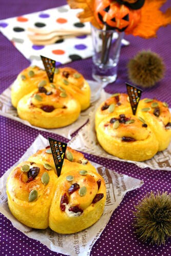 ふんわりハロウィンかぼちゃパン☆ 2011年10月08日 今日はハロウィンパン!! Cottaさんのかぼちゃパウダーを使って・・ ハロウィンパンプキンパン!! レーズン、クランベリー、クリームチーズにシナモンを振って巻きこんで・・ かぼちゃの種を散らしました(^^♪ かぼちゃにシナモン合いますね~。 ドライフルーツ ...