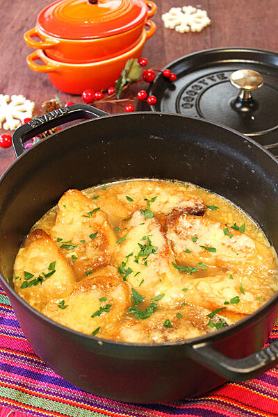ストウブでとろ~りオニオングラタンスープ☆パーティー仕立て 2012年11月28日 今日は冬のお楽しみ・・ オニオングラタンスープ!! とろっとろ~の玉ねぎが香ばしいスープに バケットとチーズを加えたこくうまなスープ。 1時間くらいじっくり炒める飴色玉ねぎがポイントですが・・ やっぱりレンジで時短(^^♪ 本来はココットなどに移してバケッ ...