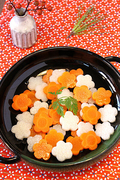 ホットペッパー1月号は長いもと人参の紅白花なます☆ 2012年12月31日 今日はお正月料理!! ホットペッパーで連載させていただいている カルチャーカフェの1月号のテーマは・・ 「花形や赤い縁起物的に見えるお正月の野菜料理」 ということで・・ 長いもと人参の紅白花なます!! 長芋とにんじんをかわいいお花型にくりぬいて 漬け込みま ...