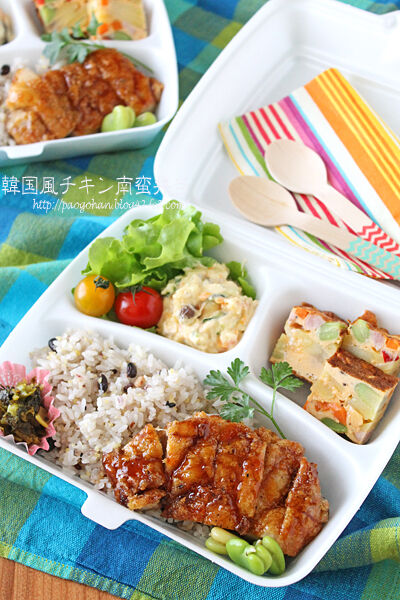 簡単鶏もも肉の韓国風チキン南蛮弁当☆デリ仕立て 2015年05月22日 今日は先日のピクニック弁当~!! メインはフライパンでカリット焼いた鶏もも肉を 甘辛韓国ダレに絡めた・・・・ 韓国風のチキン南蛮!! 副菜は作り置きなので、朝はチキンを焼くだけ~! と朝らく弁当(^^♪ モールドフードパックに詰めて・・・ 屋台のプレートラン ...