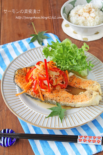 フライパンでカリカリサーモンの新玉ねぎたっぷり南蛮漬け 2015年05月19日 今日はサーモン~!! 暑くなってきたので・・・ お酢でさっぱり料理が食べたくなってきました~!! ってことで・・・サーモンの南蛮漬けを作りましたよ~! サーモンは揚げずにフライパンでカリカリにソテーして・・・ 漬け込まずに、新玉ねぎたっぷりの甘酢ソースを ...