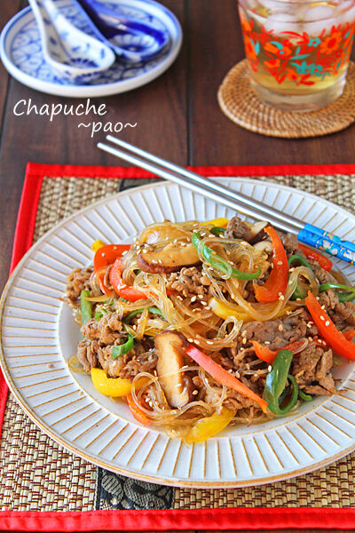 牛肉と春雨のカラフルチャプチェ☆フライパンで簡単パパッと韓国料理 2016年11月30日 こんにちは~!!今日は久々に大好きなチャプチェを作りました~!韓国春雨を使うともっちもちでコシがあっておいしいのですが・・今回はお手軽に春雨で作りましたよ~!!牛肉のうま味をたっぷり吸った野菜や春雨がとってもおいしいチャプチェ♪いつも季節の野菜で作ってい ...