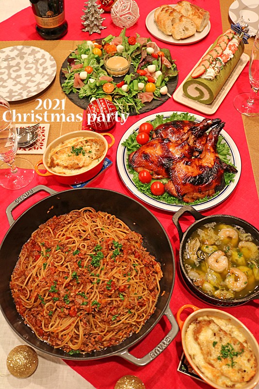 おうちクリスマスパーティー2021ワンパンボロネーゼ 2021年12月27日 こんにちは~!今日は昨日のクリスマスパーティ~♪家族でクリスマスパーティ~!!骨付きの鶏肉がいい!!とリクエストがあったので毎年あまり変わり映えないですが・・(^^♪ローストチキンボロネーゼワンパンパスタオニオングラタンスープリースサラダ牡蠣と海老のアヒージ ...