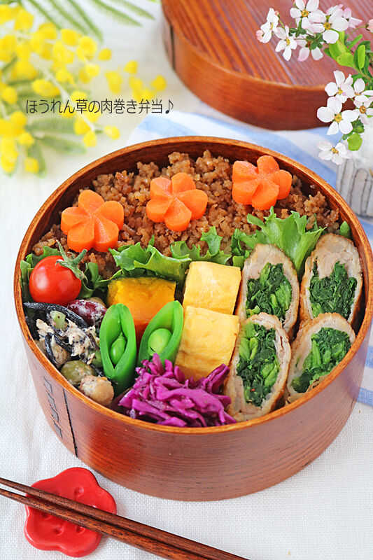 ほうれん草の肉巻き照り焼きわっぱ弁当♪ 2022年04月09日 こんにちは~!新生活、新学期が始まりましたね~♪今日は久々のわっぱ弁当です~!!最近主人がゆるゆるダイエット中なので野菜を巻いてカサ増しした肉巻き率高めです♪豚バラの方が柔らかく仕上りますが、脂少な目豚ロース薄切り肉でヘルシーに(^^♪電子レンジでチン♪した ...