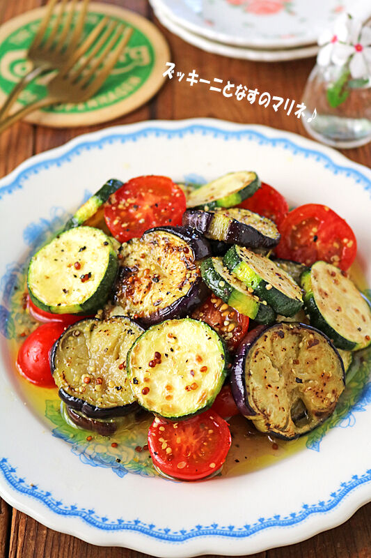 夏の作り置き♪ズッキーニとなすの焼きマリネ!そうめんのお供にも・・ 2022年08月12日 こんにちは~!今日は夏野菜レシピ~♪ズッキーニとなすの焼きマリネ夏野菜消費レシピ~!輪切りにしたズッキーニとなすをフライパンで焼いて・・マリネ液に漬けこむだけ~♪なすとズッキーニがとろ~り♪お酢でさっぱりだけどコクのあるマリネ液とミニトマトの甘酸っぱさが ...