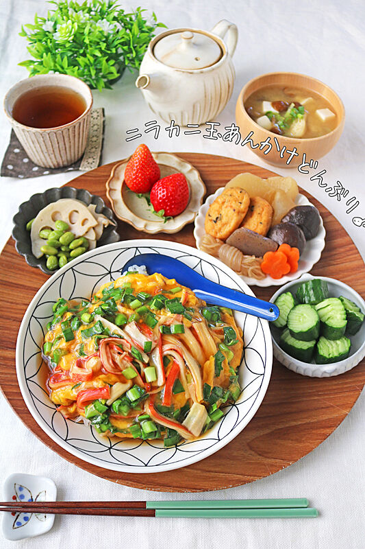 ニラかに玉あんかけどんぶりと作り置きおかずの和食献立♪ 2023年05月16日 こんばんは~!今日はお肉なしでも満足できる・・ニラかに玉あんかけどんぶりの献立です~♪ニラかに玉あんかけどんぶり蛇腹きゅうりの甘酢和えがんもと野菜の煮物レンコンと枝豆炒めなめこと豆腐の味噌汁いちごメインは・・ニラとカニカマ入りのとろとろ半熟卵に優しい和風 ...