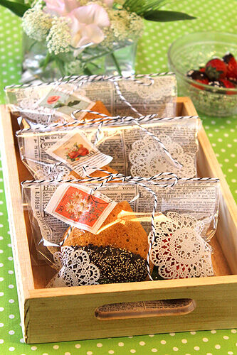 英字のワックスペーパーを敷いて栗ちゃん、苺ちゃんを入れて・・・。