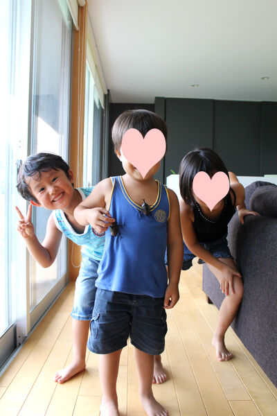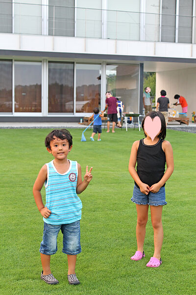 キッズはお庭のひろ~~~~~い芝生で猛暑の中走りまわり