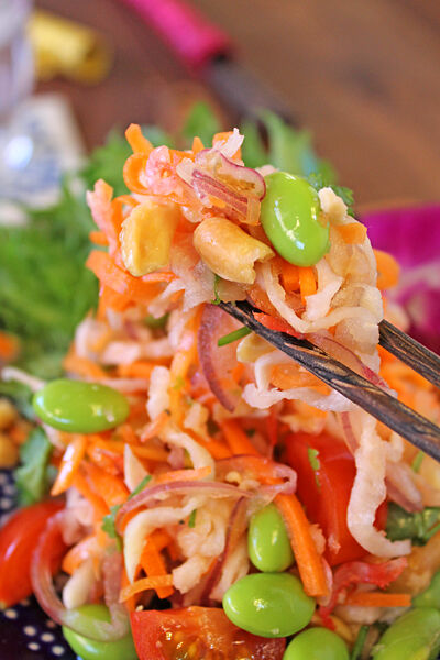 3.切干し大根、桜海老、ミニトマト、枝豆、パクチー(香草)を加え