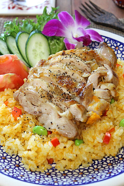 4、食べる時に鶏肉を切り、ごはんに乗せてカフェごはん風に・・(^^♪