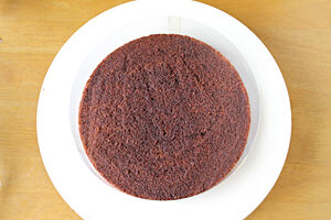 チョコスポンジを2枚にスライスし、シロップをたっぷり塗り・・