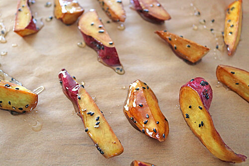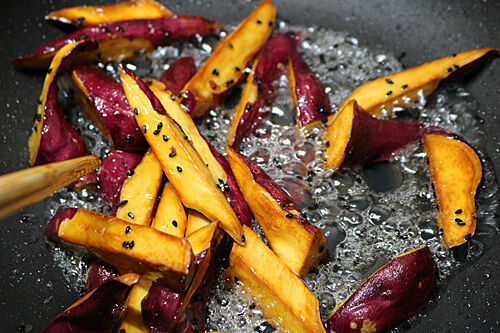 3の揚げたさつまいもを加えて全体に手早く絡め、黒ゴマを加えて混ぜ合わせる。