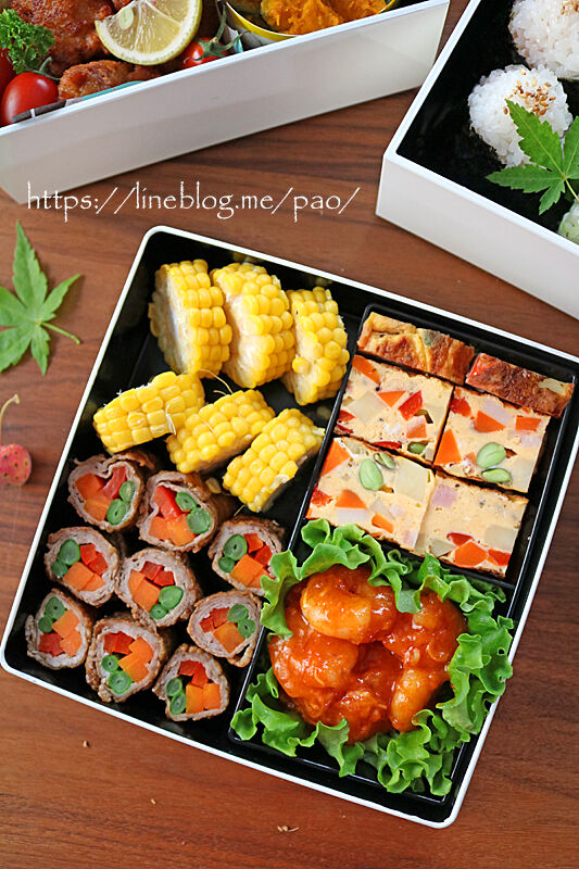 おにぎりや牛肉巻き、オムレツの残りものを詰めたお重が
