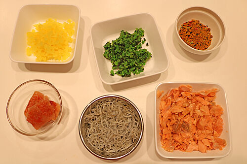 沢庵、野沢菜や高菜又はしその実、カレーふりかけ(混ぜ込むタイプ)