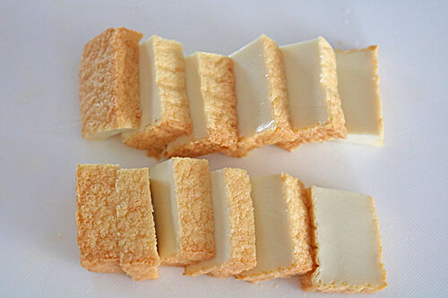 1、厚揚げは熱湯をかけて油抜きし、キッチンペーパーなどで水気を取り、