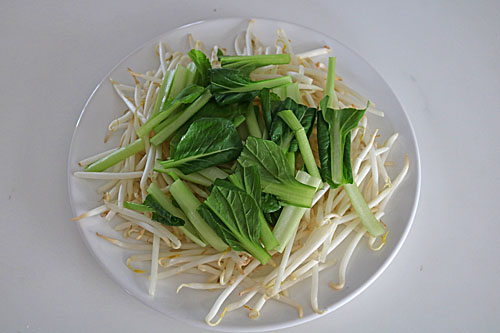 2、耐熱皿にもやし、4cmくらいの長さに切った