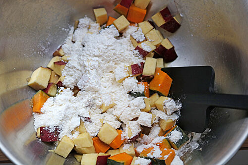 1、かぼちゃさつまいもは角切りにして、さつまいもは水にさらしておく。