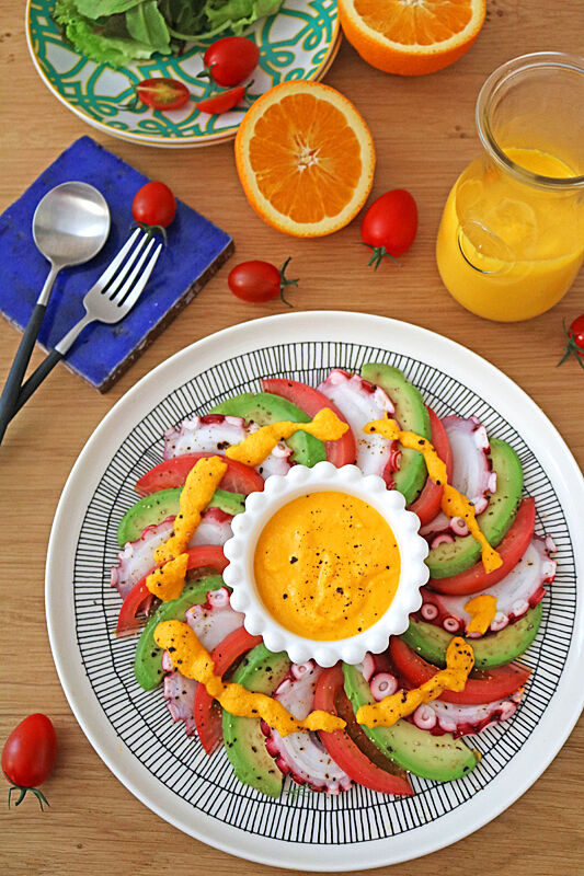 人参とオレンジのドレッシングでタコとアボカドのカルパッチョ