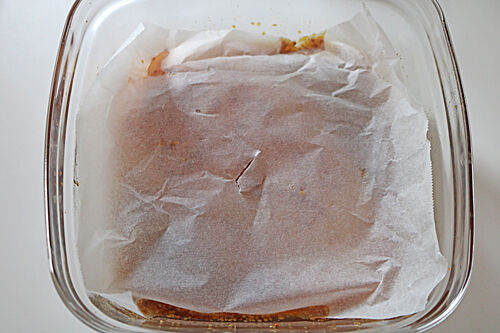 2、オーブンシートの真ん中を少し破り、落とし豚にし、