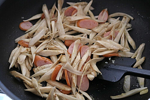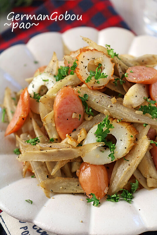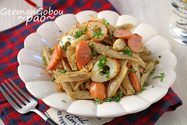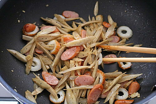 1、ごぼうはピーラーで皮を剥いて、包丁で、