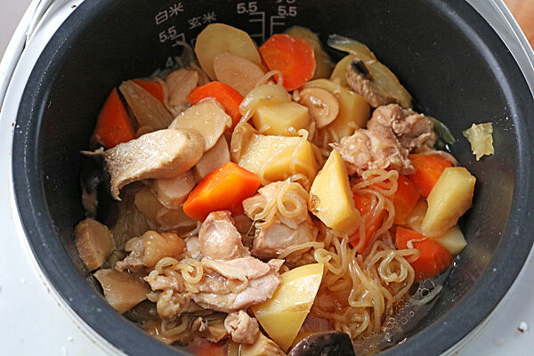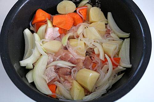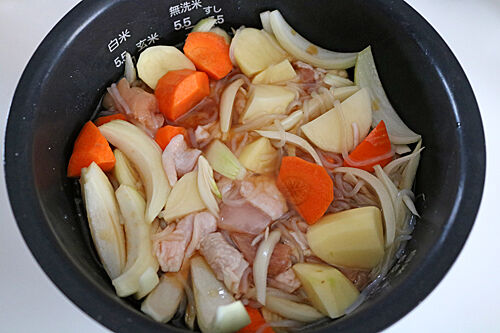 野菜を炊飯器に入れ、ごま油をまぶす。