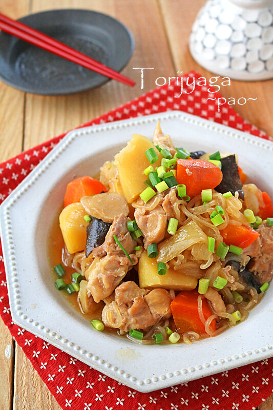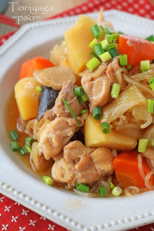 2、玉ねぎはくし切り、じゃがいも、人参は乱切りにする。