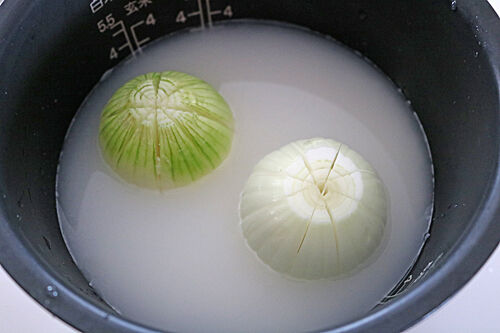 2、玉ねぎに深く切り目を入れ、1の炊飯器に入れる。