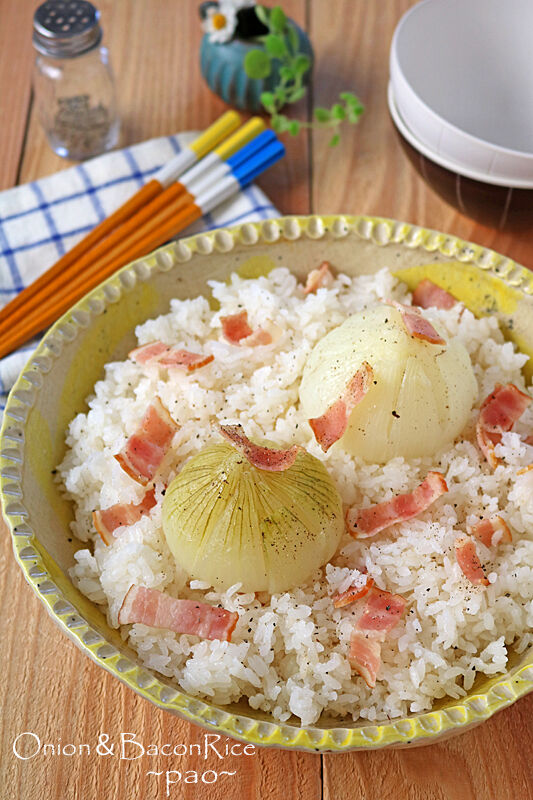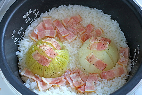 今日は炊飯器で簡単丸ごと新玉ねぎとベーコンのごはんです。