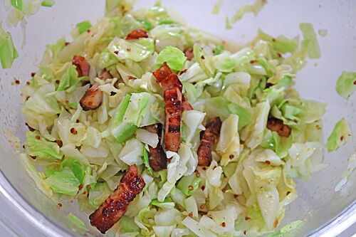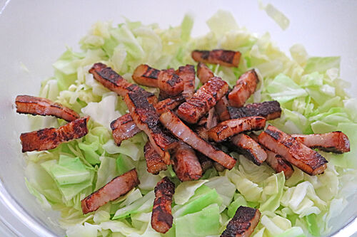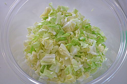 1、キャベツは1~2cm角くらいに切る。芯の部分は小さく刻む。