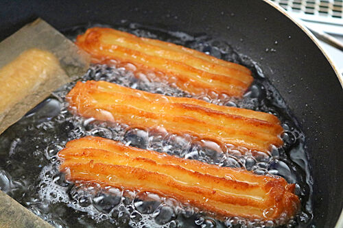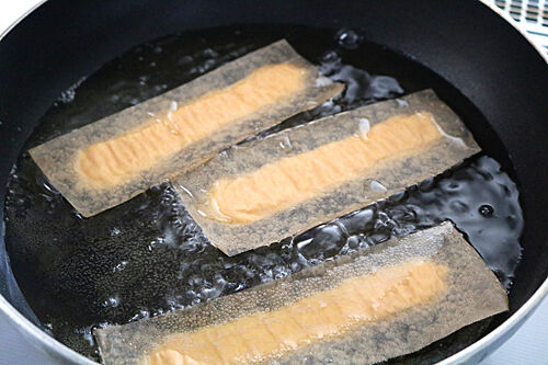 5、こんがり焼き色がつくまで揚げたら裏返す。