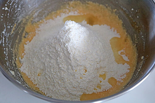 2、ホットケーキミックスをふるい入れ、ゴムベラで切るように