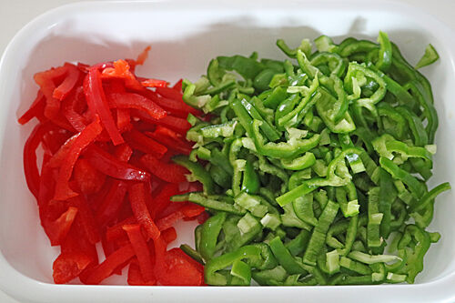 1、ピーマン、パプリカは3cmの長さの細切りにする。