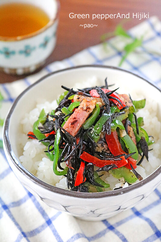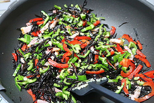 3、生ひじき、ピーマン、パプリカを加えて炒める。