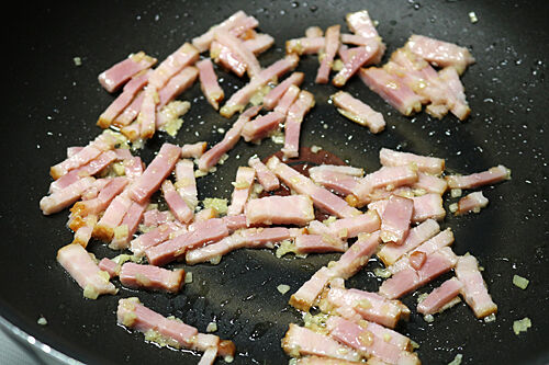 2、フライパンにごま油、にんにくを加えて弱火で熱し、