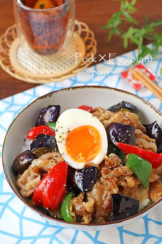 簡単のっけ丼!豚バラと茄子の甘辛スタミナみそ炒めどんぶり♪