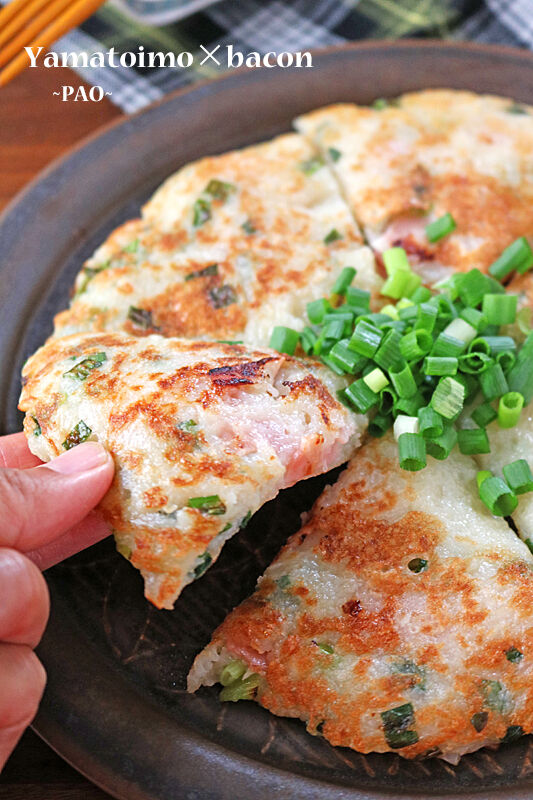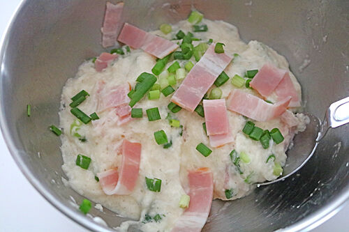2、ベーコンは1cm幅に、万能ねぎは小口切りにする。