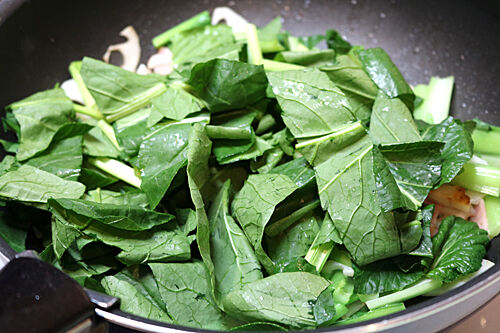 3、ベーコンと小松菜の茎の部分を加えて炒める。