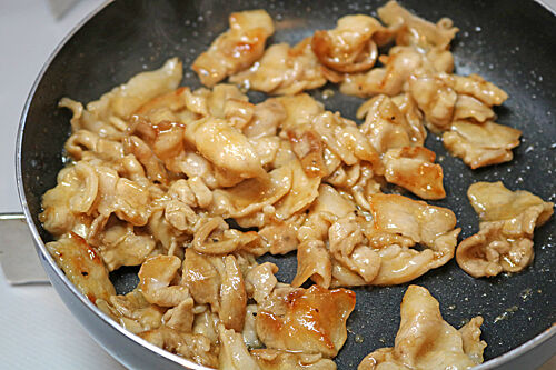 フライパンにサラダ油を熱し、豚肉を炒める。
