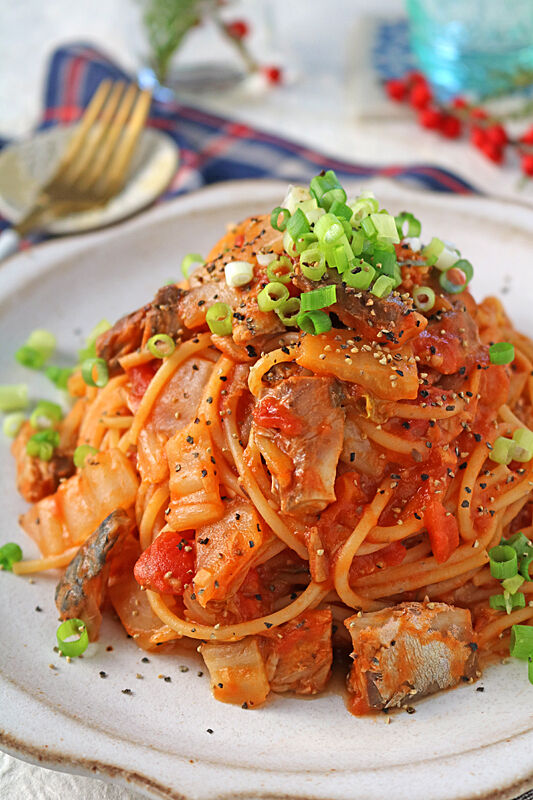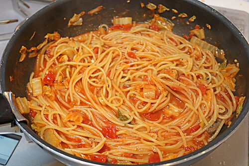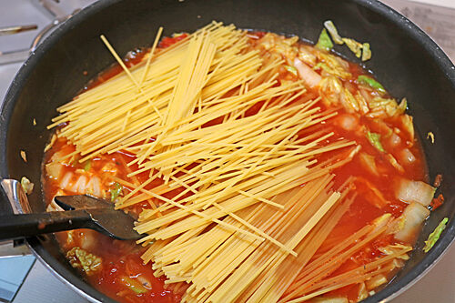4、半分に折ったパスタを加えて、汁にパスタがなるべく