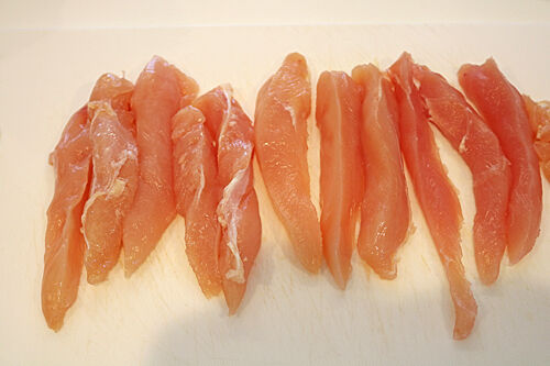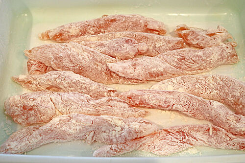 2、ささみの水気をよくふきとり、周りにてんぷら粉をまぶす。