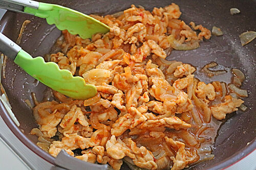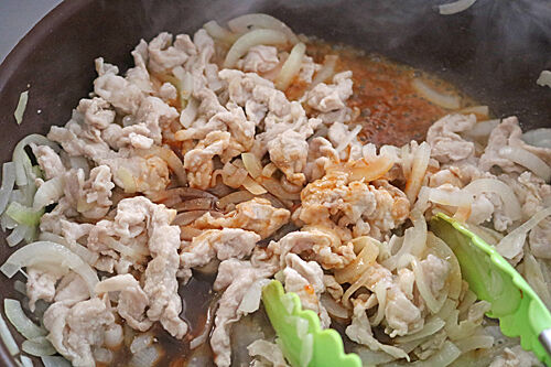 少ししんなりしてきたら豚肉を加え、ほぐしながら炒める。