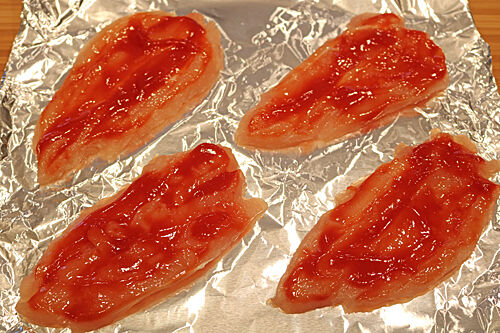 ケチャップににんにくを加えて混ぜ合わせ、ささみに塗る。