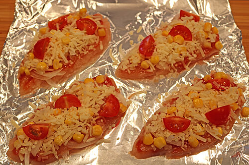 ささみにピザソースや具を乗せて焼いているので