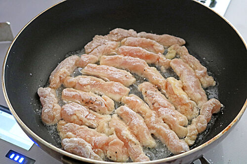 6、フライパンにサラダ油を熱し、5の鶏むね肉を焼く。